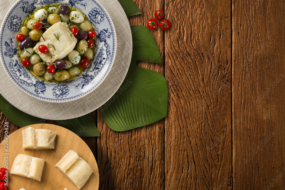 A typical Portuguese dish with codfish called Bacalhau do Porto in a original portuguese plate.