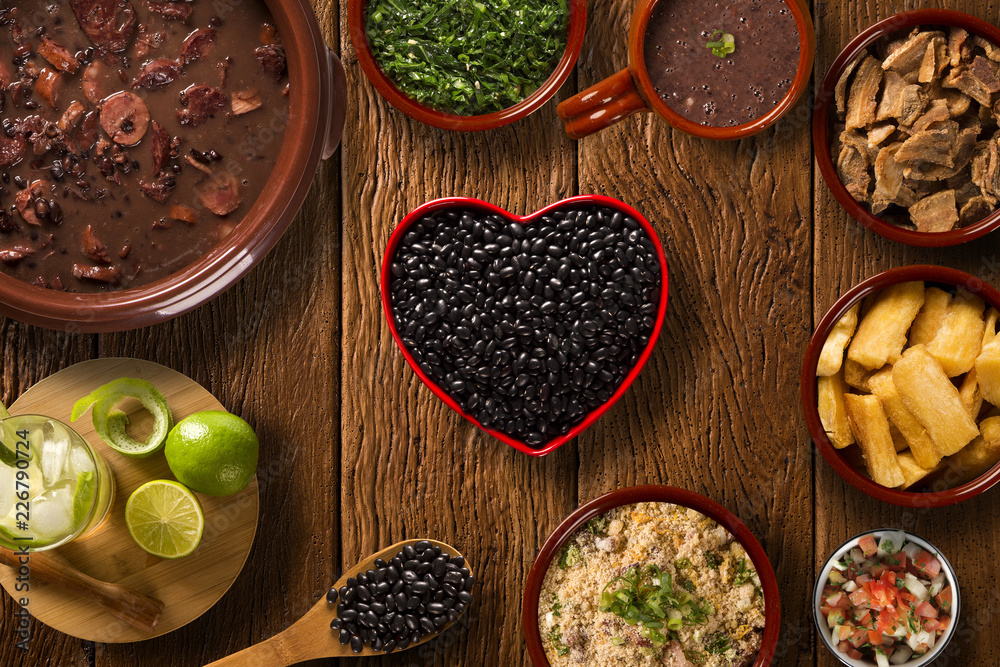 Brazilian Feijoada Food. Top view with red heart bean pot.