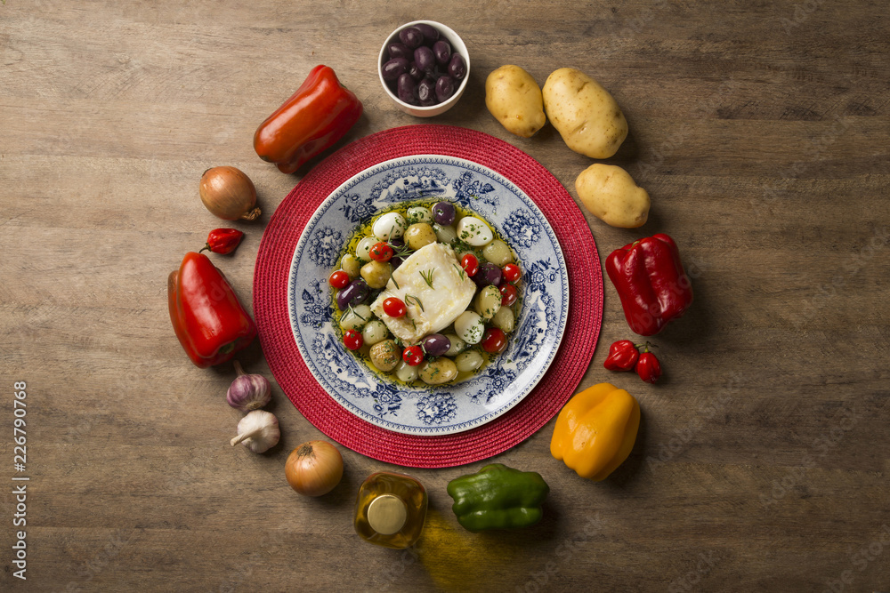 A typical Portuguese dish with codfish called Bacalhau do Porto in a original portuguese plate.