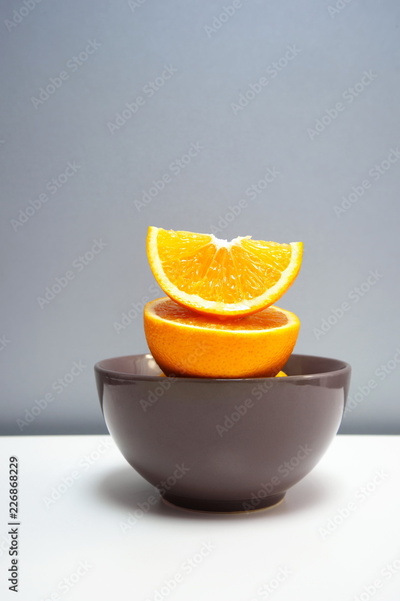 half and slice of orange fruit for food in grey blow on white table healthy lifestyle background