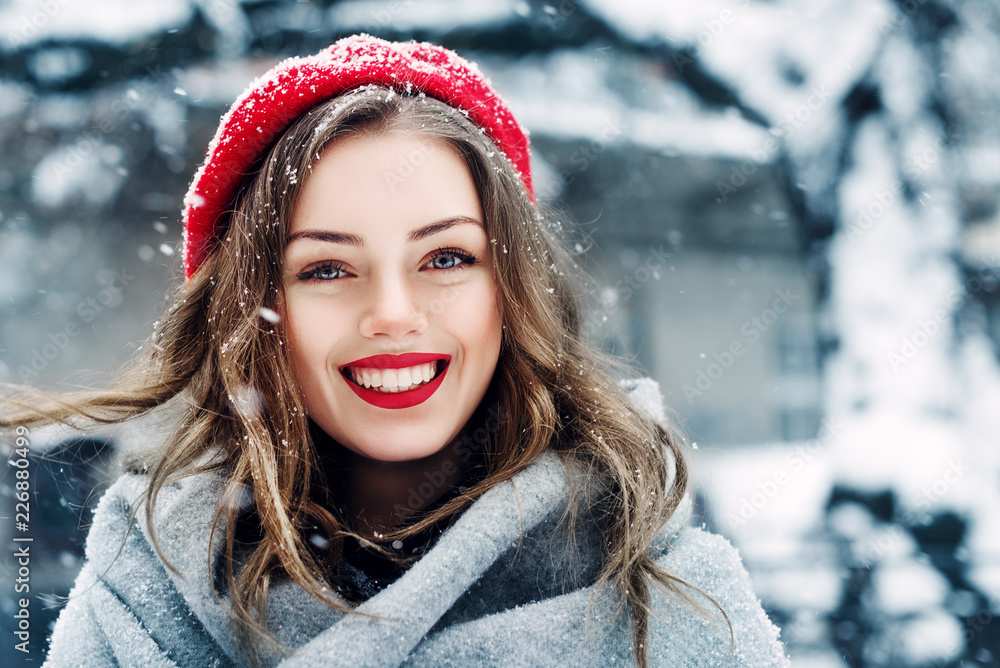 Outdoor close up portrait of young beautiful happy smiling girl with red lips, wearing french style beret, posing in street of european city. Winter fashion, Christmas holidays concept. Copy space