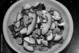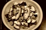 A creative, tasty Oriental wheat noodle salad, includes zucchini squash, carrots, avocado, red peppers, sesame seeds, served in a stylish blue salad bowl.