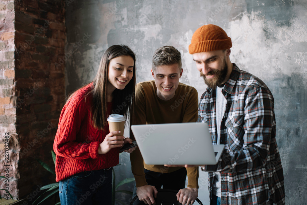 Group of university students learning languages together using laptop computer and internet, watching training course. Collaborate. Online education concept. Creative team discussing startup project.
