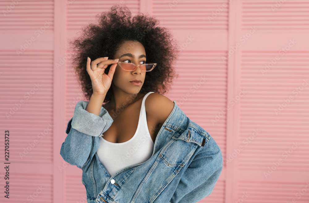 Cute African American woman with beautiful sexy body posing for pictures and standing near pink background. Young curly hair hipster girl wearing stylish jacket and eyeglasses in showroom. Shopping