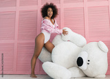 Smiling African American woman with beautiful face and curly hairstyle in pink denim jeans jacket and sexy lingerie hugging large plush bear toy. Birthday present for positive dark skinned female.