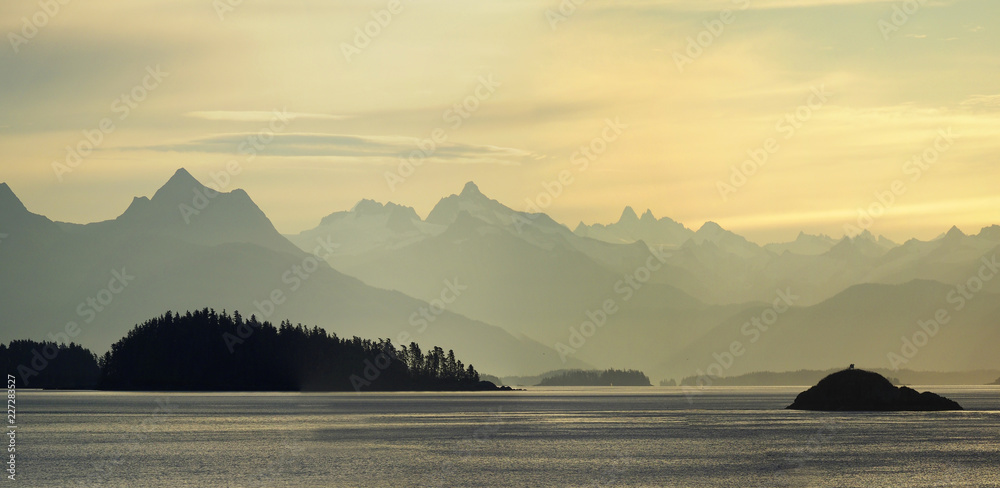 Panorama of Alaskan Mountains at Sunset from the Ocean