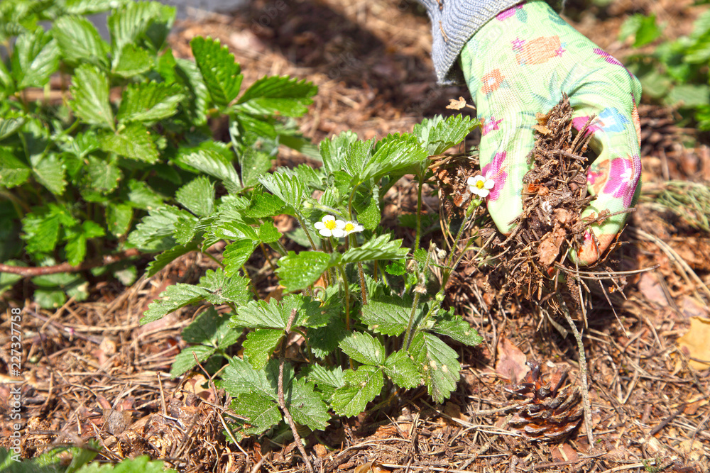 A gardener harbors strawberry mulch from dry grass, organic farming. Growing plants in a garden.