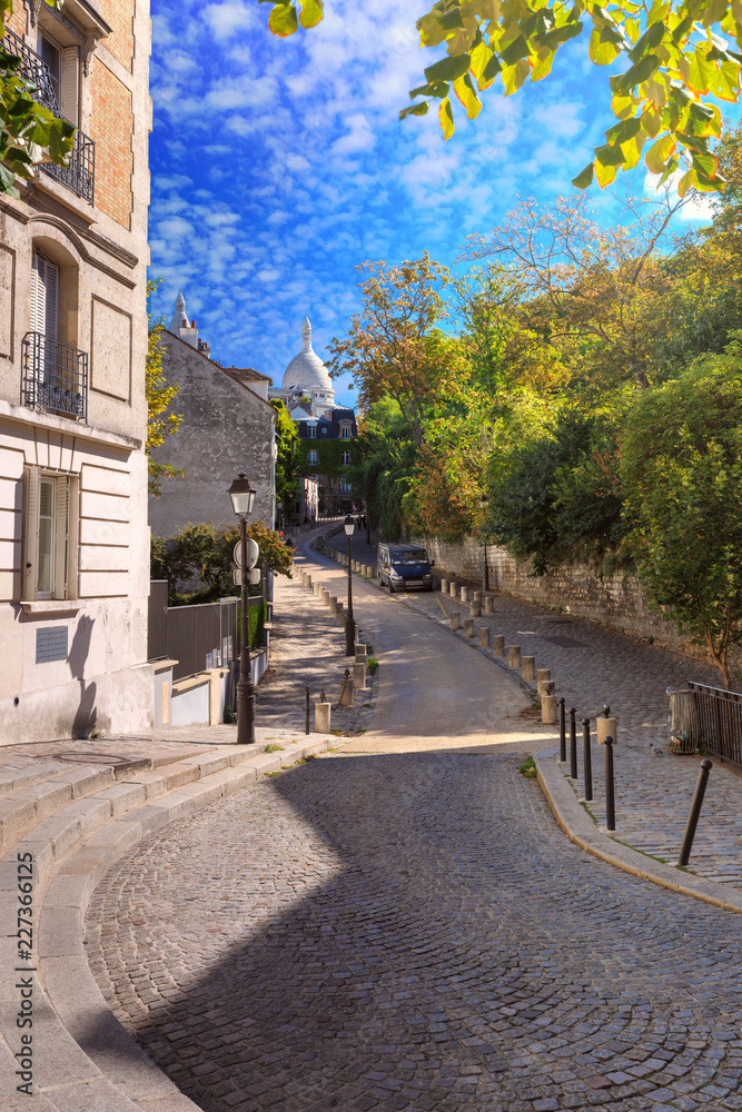 Cozy old street and Sacre-Coeur Basilica at the sunny summer morning, quarter Montmartre in Paris, France