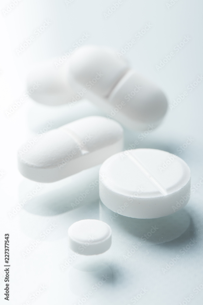 Pharmacy theme, white medicine tablets antibiotic pills.