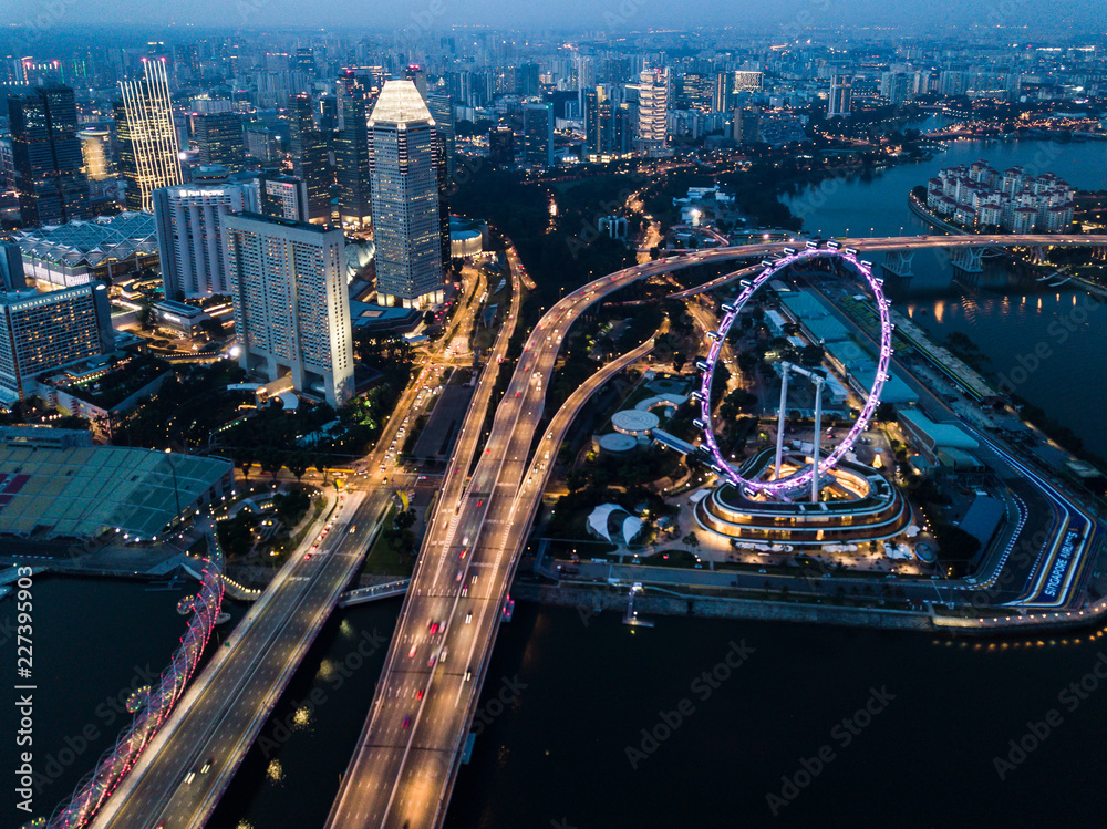 Singapore city drone view at dusk