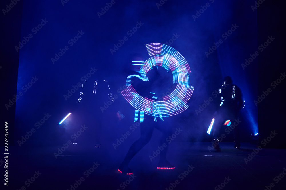 Laser show performance, dancers in led suits with LED lamp, very beautiful night club performance, party