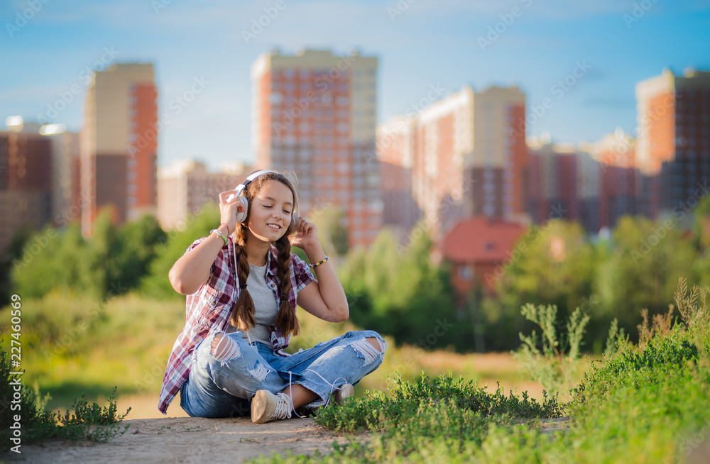 young girl listening music headphones, urban street style, outdoor street style hipster dj woman in black cap headphones dj listening to music and smiling, orange, crazy style city background, sunset