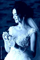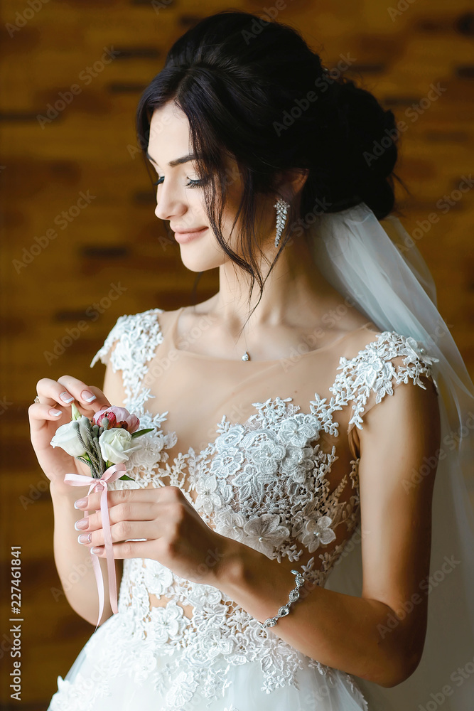 gorgeous bride with boutonniere portrait near window. bridal boudoir on wedding day. beautiful woman getting ready for wedding, holding flowers. bride and wedding concept