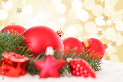 Weihnachten rote Weihnachtskugeln Weihnachtsdeko Weihnachtsdekoration Gold Sterne Dekoration Schnee Textfreiraum Copyspace