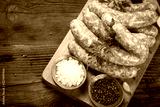 Raw sausages on the wooden board