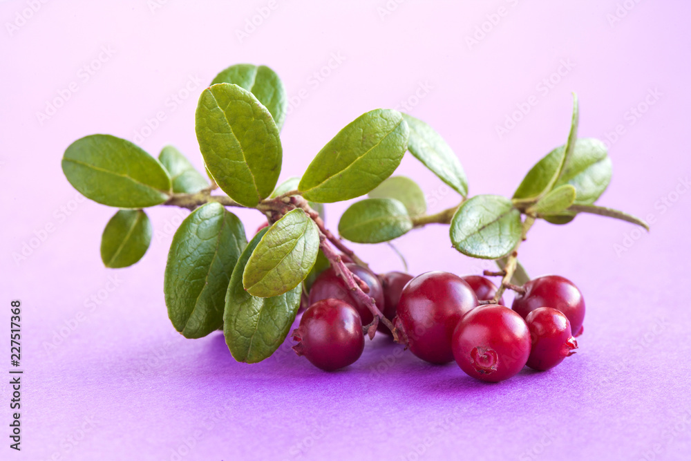 Wild cowberry on purple background. Ripe red forest berries Vaccinium vitis-idaea with green leaves.