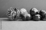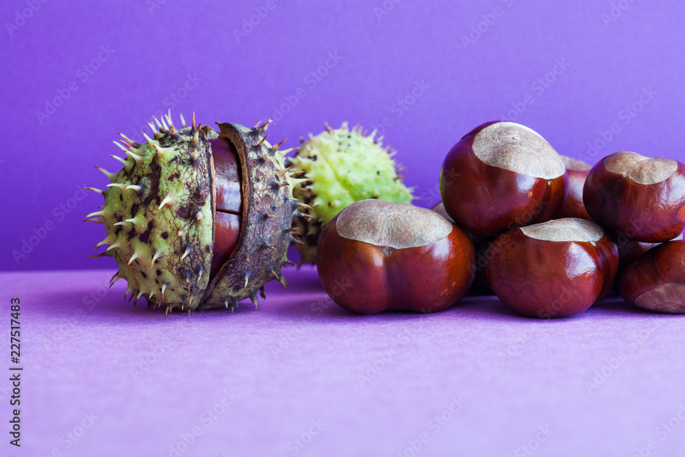 Horse chestnut seeds on purple violet background. Autumn artistic still life with Aesculus hippocastanumon ripe Buckeye fruits.