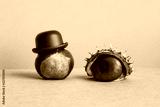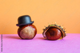 Mister Horse chestnut seed and Buckeye fruit Aesculus hippocastanumon on brown violet background. Autumn decorative background