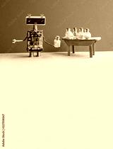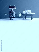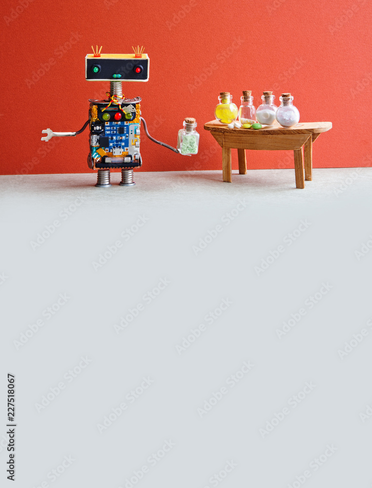 Robot medic pharmacist testing modern pills in glass bottles. Creative design laboratory interior. Red wall, gray floor. Copy space