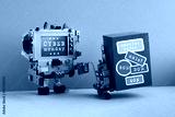 Cyber monday promotion poster. Funny robotic computer moving shopping cart with big blue box, sale stickers. Brown wall, blue floor background