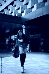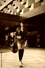 Beautiful, sexy and fashionable brunette model girl with bright makeup, in the jeans shorts, in a leather jacket and in a hat, walking outdoors with a stylish black backpack in her hand