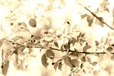 Tender spring floral nature garden landscape. Blossoming fruit tree branch, pink petal flowers fresh green leaves in the rays of sunlight. Soft focus, beautiful bokeh