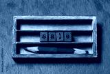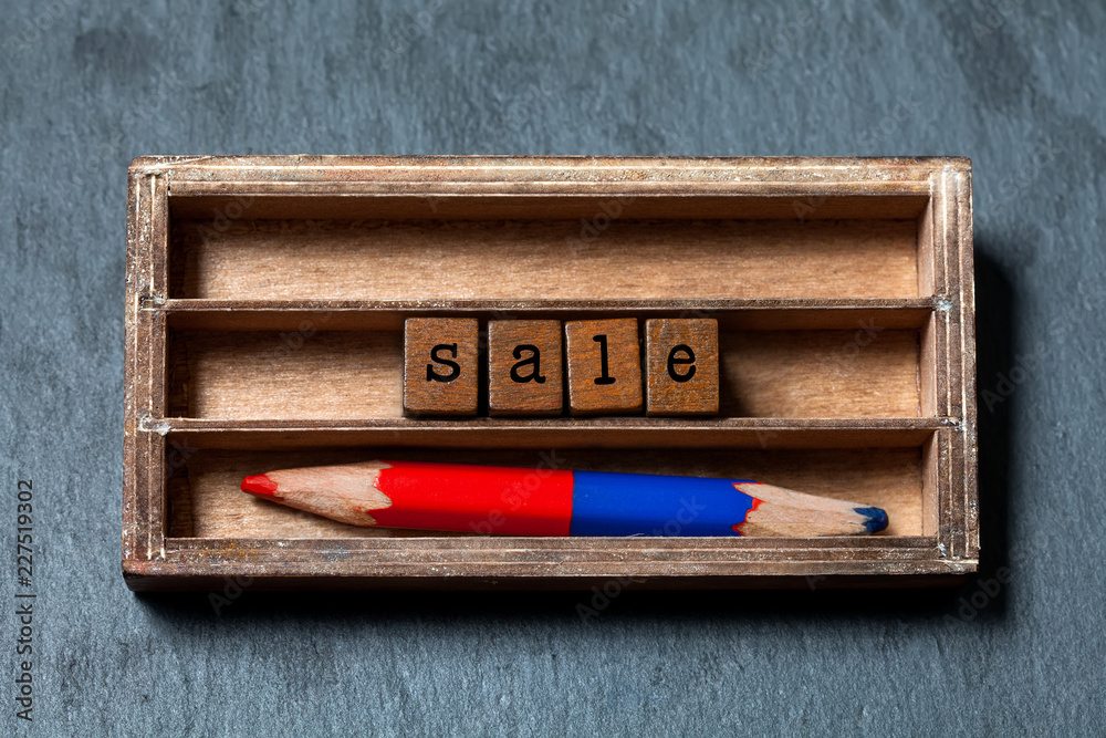 Sale discount promotion poster. Special offer shopping time concept. Vintage box, wooden cubes with old style letters and red blue pencil. Gray stone textured background.