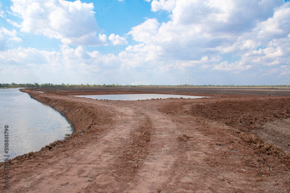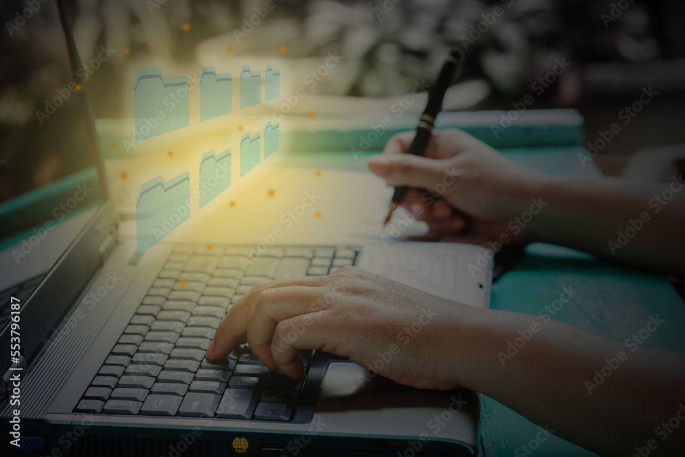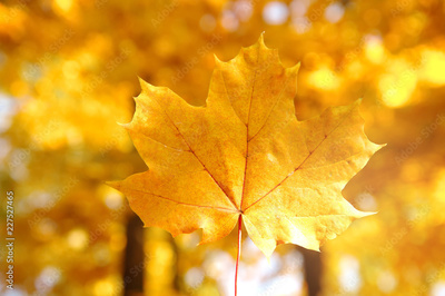 single leaf of orange yellow maple with forest tree in autumn or fall with morning sunlight seasonal nature background