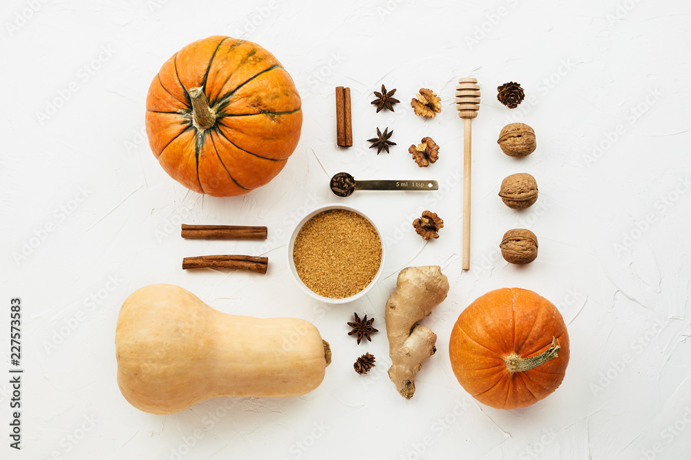 Flat lay with various pumpkins, cinnamon stick and cane sugar knolled together on white cement background