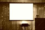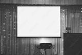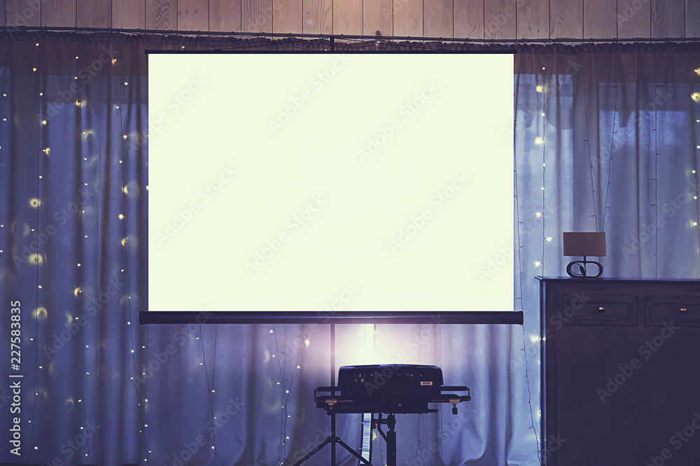 Front view of decorated wedding room with empty white projector screen in the centre. Equipment for video and slideshow projection at a festive event. Banquette hall with a board for projection.