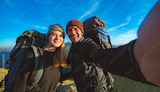 The happy couple taking a selfie on the mountain background