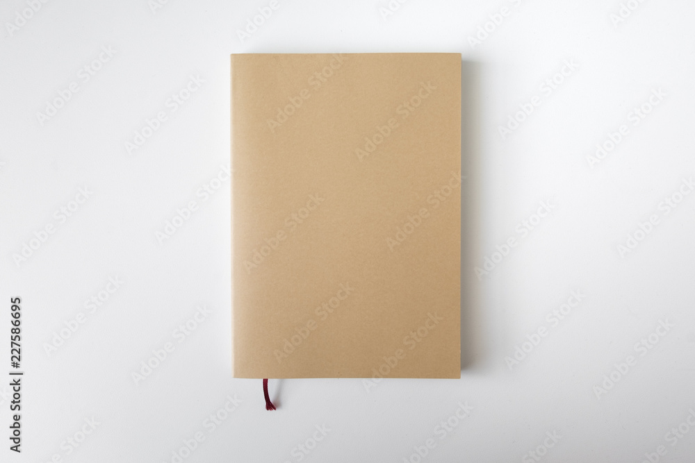 Top view of closed blank craft paper cover notebook with pencil on white desk background