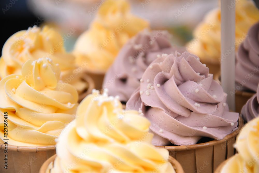 Close up Cup Cake vanilla cream topping pastel colour event on shelve decoration
