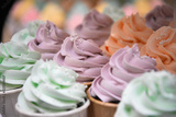 Close up Cup Cake vanilla cream topping pastel colour event on shelve decoration