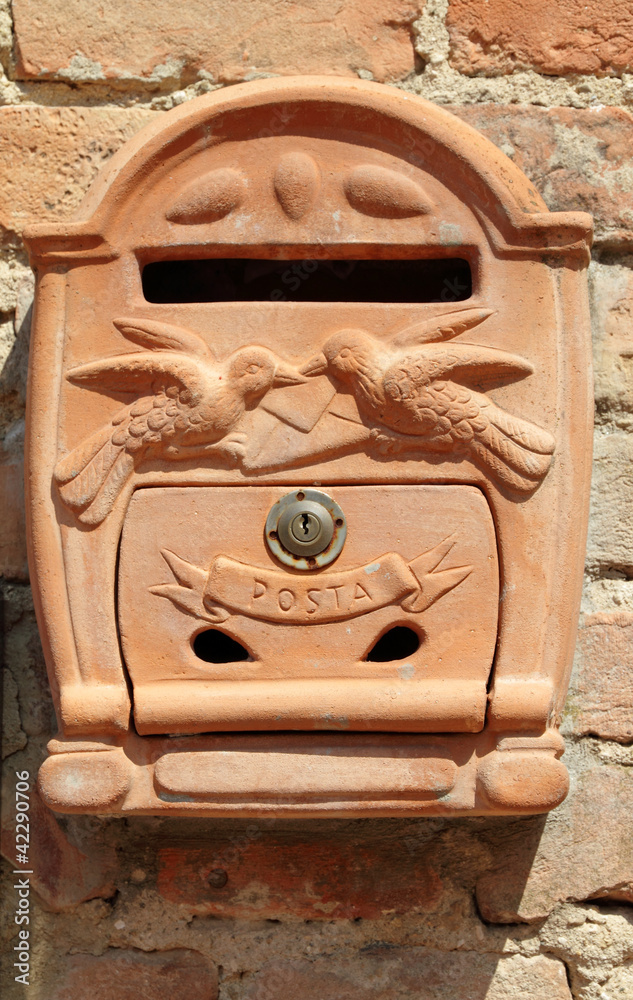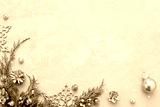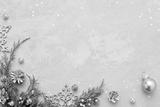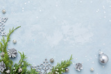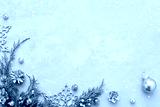 Christmas and New Year background, copy space. Frame of green twigs and silver christmas decorations on blue. Top view.