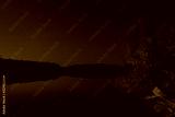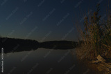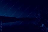 the stars in the night sky are reflected in the mirror smooth surface of the lake, and the moon illuminates the forest on the opposite bank