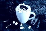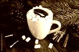 Hot cocoa with marshmallows,chocolate cookies in the white cup and Christmas composition on the brown wooden background