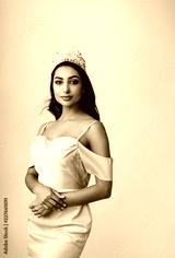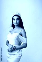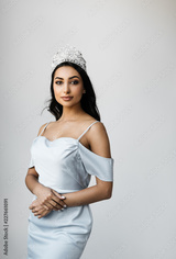 Crowned queen of beauty concept. Cheerful asian woman wearing elegant trendy dress receiving an award for winning beauty pageant. Portrait of attractive fashion model posing for pictures.