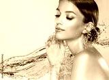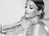 Beautiful spa woman with water splashes. Moisturizing facial skin, beauty and care.