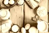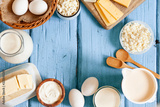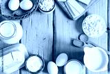 Different types of dairy products on blue wooden background: milk, sour cream, cottage cheese, cheese, cream, yogurt, eggs and butter top view with copy space