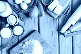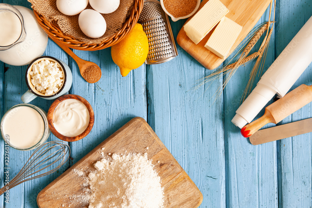 Frame of food ingredients for baking on a blue woodenl background. baking concept top view
