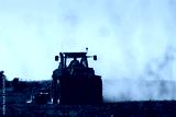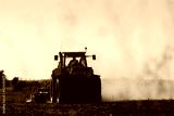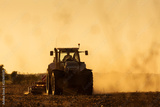 Modern tractor plowing at the sunset with lot of dust in background and with a plane taking off