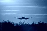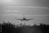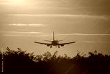 Silhouette of air plane landing at sunset