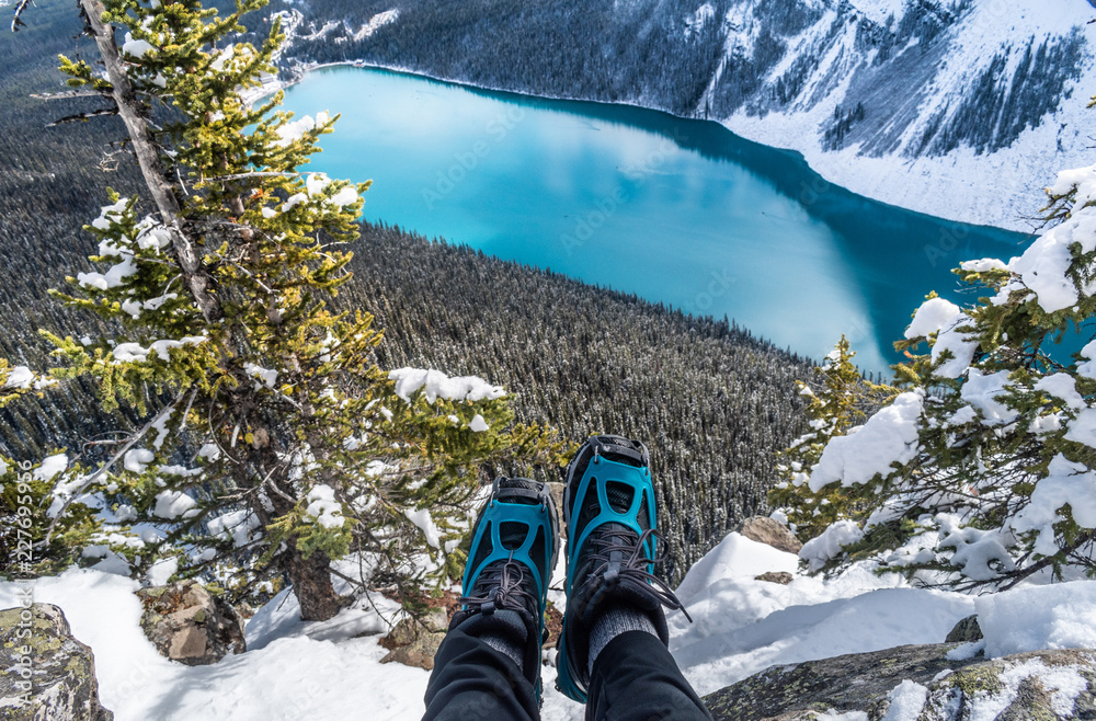 Winter boots hanging over blue glacial lake.