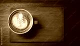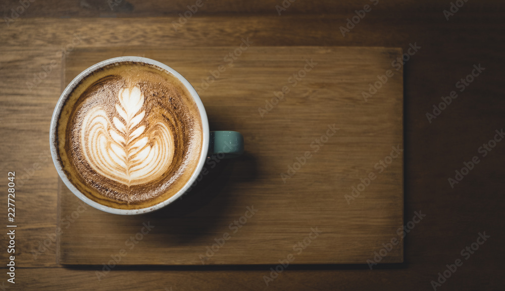 Top view of hot cappuccino coffee cup on wooden tray with latte art on wood table at cafe,food and drink dark tone,leave space for adding text.