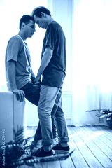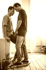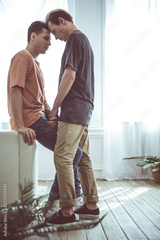 Full length portrait of handsome guy with dyed hair holding boyfriend hand while he sitting on armrest of couch. Loving men touching foreheads