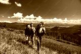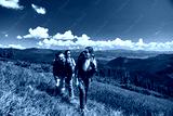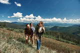 Cheerful man and two women hiking in mountains. They are travelling with rucksacks together along path up to top