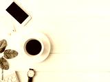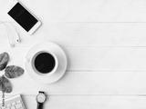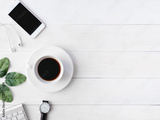 top view of office desk workspace with coffee cup, notebook, plastic plant, smartphone and keyboard on white background, graphic designer, Creative Designer concept.