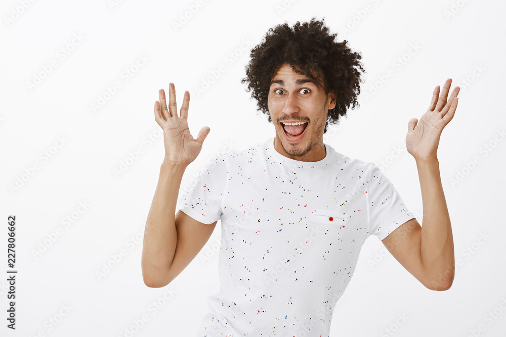 Here I am. Portrait of friendly-looking joyful and emotive happy guy with moustache and afro hairstyle waving raised palms and smiling broadly while fooling around and spending time in fun and joy