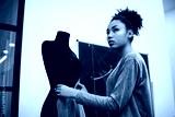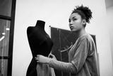 Young curly hair fashion designer standing near mannequin and working project at atelier. African American talented tailor doing assignment in work space. Successful business.
